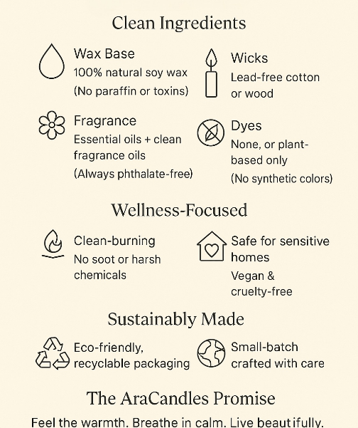 EXPLORE WELLNESSIlluminate your wellness withAraCandles. Crafted with love, eco-friendly ingredients, and unique fragrance blends, our candles provide more than just light—they offer a sensory experience that nurtures your mind, body, and spirit. Support your wellness journey while caring for the planet, and let our soothing scents guide you toward inner peace, balance, and rejuvenation.